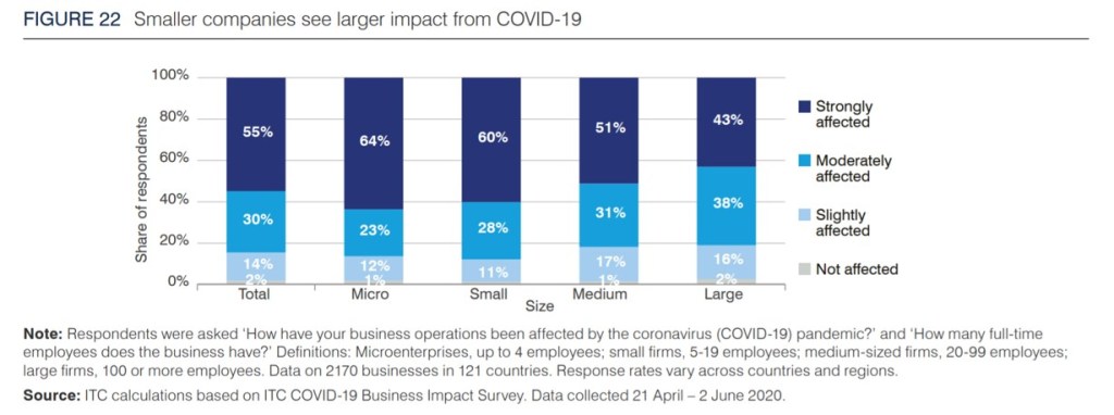 A global survey by the International Trade Centre, an agency of WTO and UN, reported in SME Competitiveness Outlook 2020, showed that The majority (55%) of businesses had been strongly affected by the pandemic and the measures taken to contain it. Smaller companies tended to be more strongly affected by COVID-19 than larger ones. Nearly two-thirds of micro and small firms said their business operations were strongly affected by the crisis, compared with about 40% for large companies.