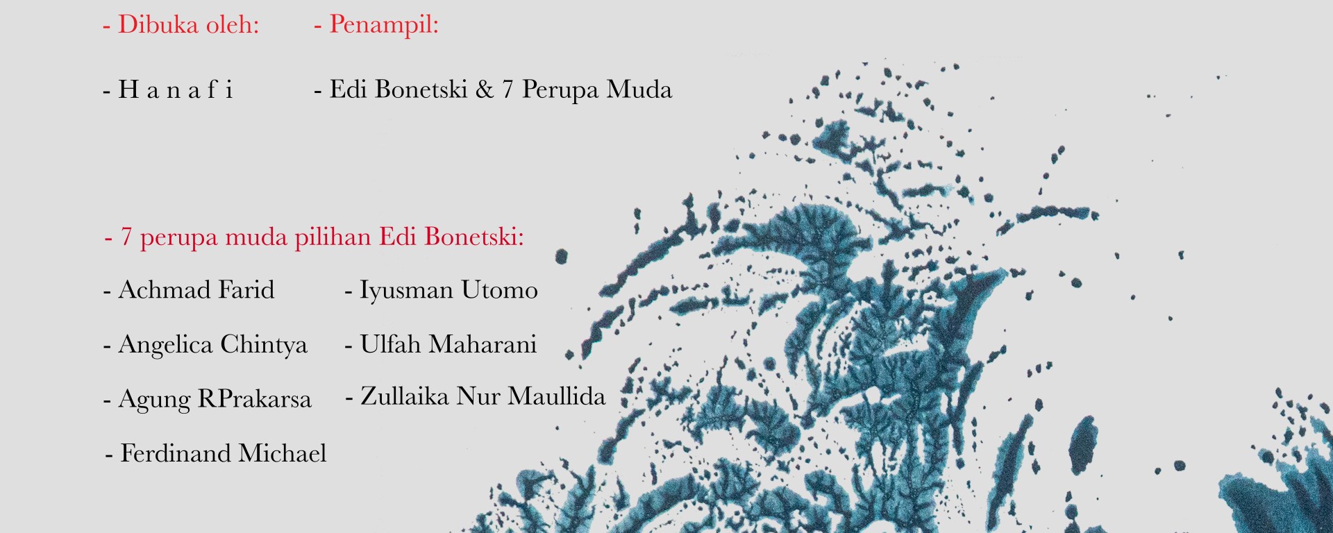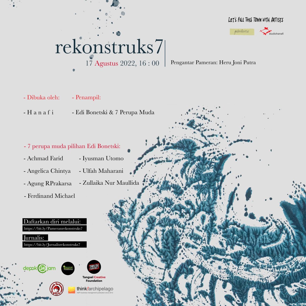 Mengikuti pameran perupa Edi Bonetski yang bertajuk “Ondel-ondel: Yang Rural dan yang Urban,” studiohanafi membuka kesempatan bagi seniman muda untuk berpameran di galerikertas di bawah bimbingan Edi Bonetski dan perupa Hanafi. Dari sekitar 20 perupa muda yang mempresentasikan karyanya, terpilih 7 perupa yang kini telah menjalani proses workshop di galerikertas dan siap menampilkan karya-karya kertas dan instalasinya pada pameran yang bertajuk “Rekonstruks7” mulai dibuka pada tanggal 17 Agustus hingga 17 September 2022.