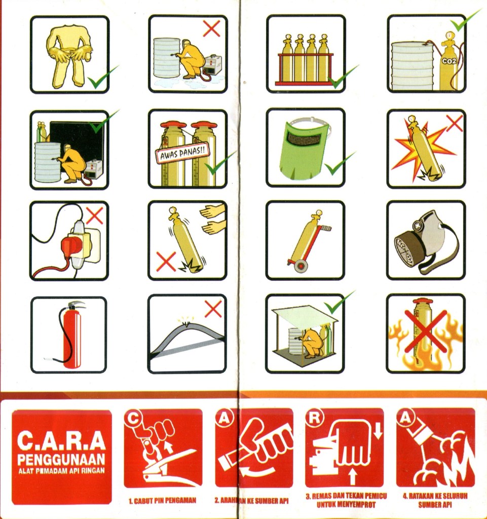 | Saat bekerja | 1. Ingat letak APAR terdekat dari posisi kerja, dan posisikan agar relatif mudah terjangkau. 2. Pastikan ada koordinator yang mengawasi pekerjaan. 3. Pastikan ada 1 orang pengawas api (fire watch). 4. Gunakan APD sesuai kebutuhan, seperti hand gloves, safety glasses, welding mask, safety shoes, apron, full body suit. |