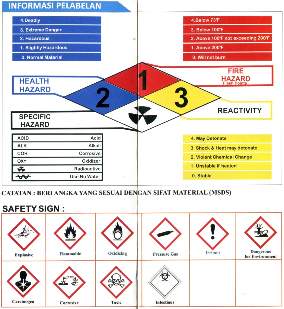 | Setelah bekerja | 1. Pastikan penempatan zat kimia sesuai lokasi penyimpanannya, dan dalam kondisi aman. 2. Pastikan informasi di kemasan zat kimia menghadap keluar dan dalam kondisi baik. 3. Kembalikan MSDS ke tempat semula setelah digunakan. 4. Periksa kesehatan jika terpapar. |