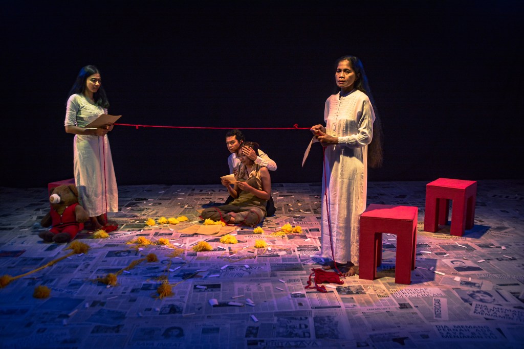 Ruang hitam dengan lantai yang ditutupi tumpukan koran, kertas-kertas berserakan, sebuah mesin ketik, benang rajut berwarna merah menjadi panggung kelima aktor mainteater yang disutradarai Heliana Sinaga. Meskipun mengalih wahanakan dalam bentuk teater film namun dramaturgi dibangun dengan realisme yang ketat. Dalam durasi 2 jam, mainteater mementaskan secara utuh dan bersetia pada naskah karena setiap fragmen dirasa menjadi penting disampaikan.